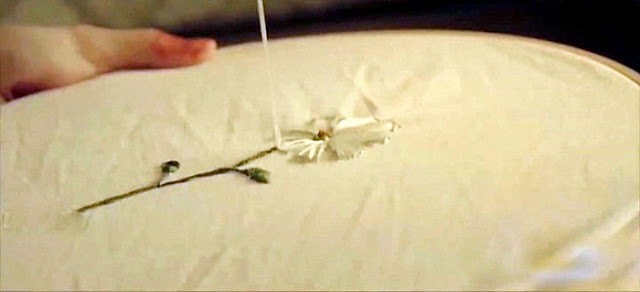 В думах о муже вышивает подаренный им смешной букетик ромашек.